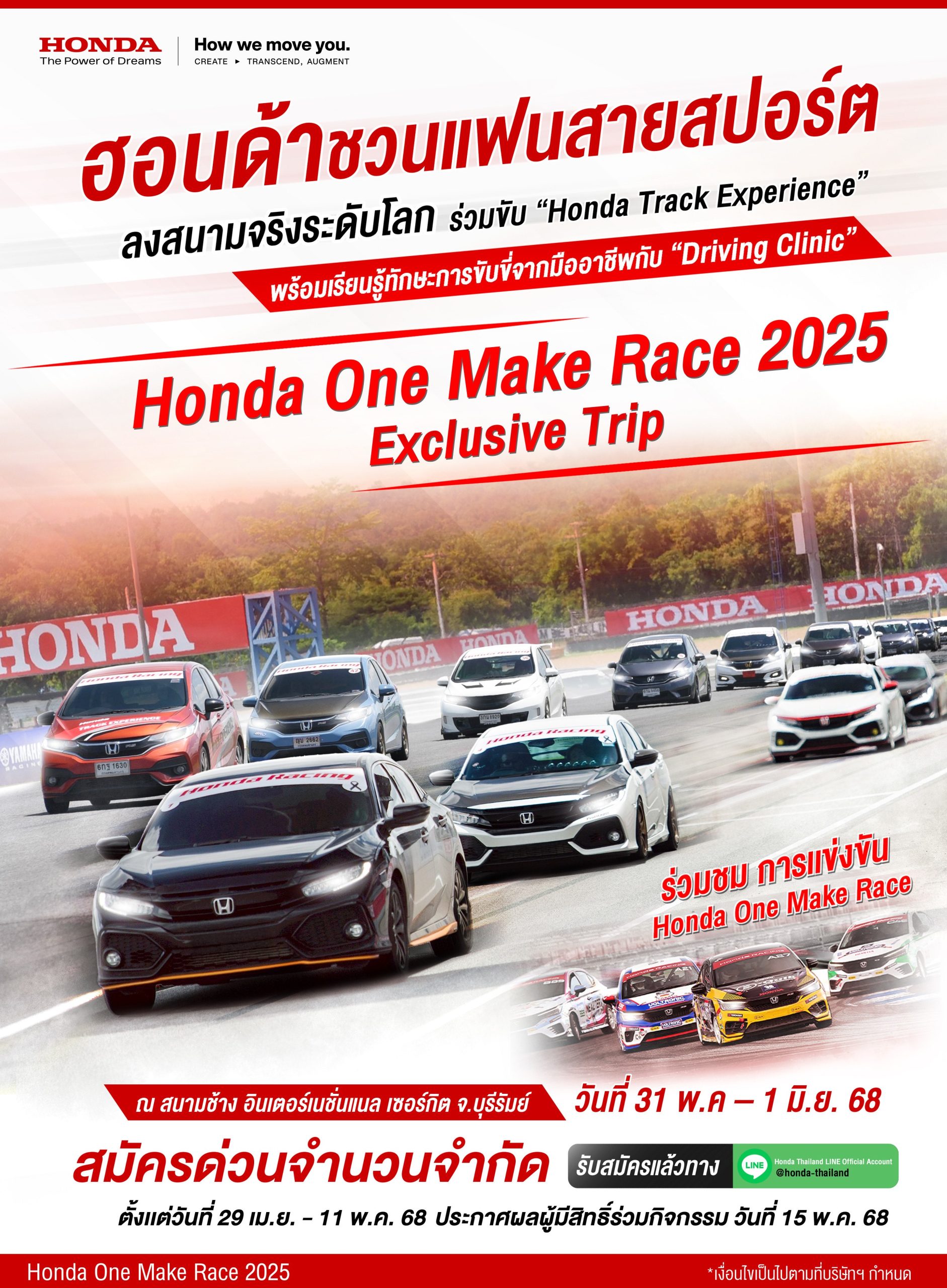 บริษัท ฮอนด้า ออโตโมบิล (ประเทศไทย) จำกัด ชวนแฟนสายสปอร์ตขับรถยนต์ฮอนด้าคู่ใจรุ่นใดก็ได้ ออกทริป 2 วัน 1 คืนกับ “Honda One Make Race 2025 Exclusive Trip” เพื่อสัมผัสประสบการณ์ความมันสุดเร้าใจกับฤดูกาลแรกของการแข่งขัน “Honda One Make Race 2025” ณ สนามช้าง อินเตอร์เนชั่นแนล เซอร์กิต จ.บุรีรัมย์ ซึ่งเป็นซัพพอร์ตเรซ (Support Race) ในการแข่งขัน “Fanatec GT World Challenge Asia 2025” การแข่งขันรถยนต์ทางเรียบระดับโลก พร้อมเสริมทักษะและเรียนรู้เทคนิคการขับขี่อย่างสนุกสนานและปลอดภัยทั้งภาคทฤษฎีและภาคปฏิบัติจากผู้เชี่ยวชาญระดับมืออาชีพกับกิจกรรม “Driving Clinic” ก่อนจับพวงมาลัยลงขับบนสนามแข่งระดับโลกแบบเอ็กซ์คลูซีฟกับกิจกรรม “Honda Track Experience” พร้อมรับสิทธิพิเศษอื่นๆ โดยกิจกรรมจะจัดขึ้นในวันเสาร์ที่ 31 พฤษภาคม – วันอาทิตย์ที่ 1 มิถุนายน 2568 ร่วมกิจกรรมกับฮอนด้าฟรี ! ไม่มีค่าใช้จ่ายเพิ่มเติม*