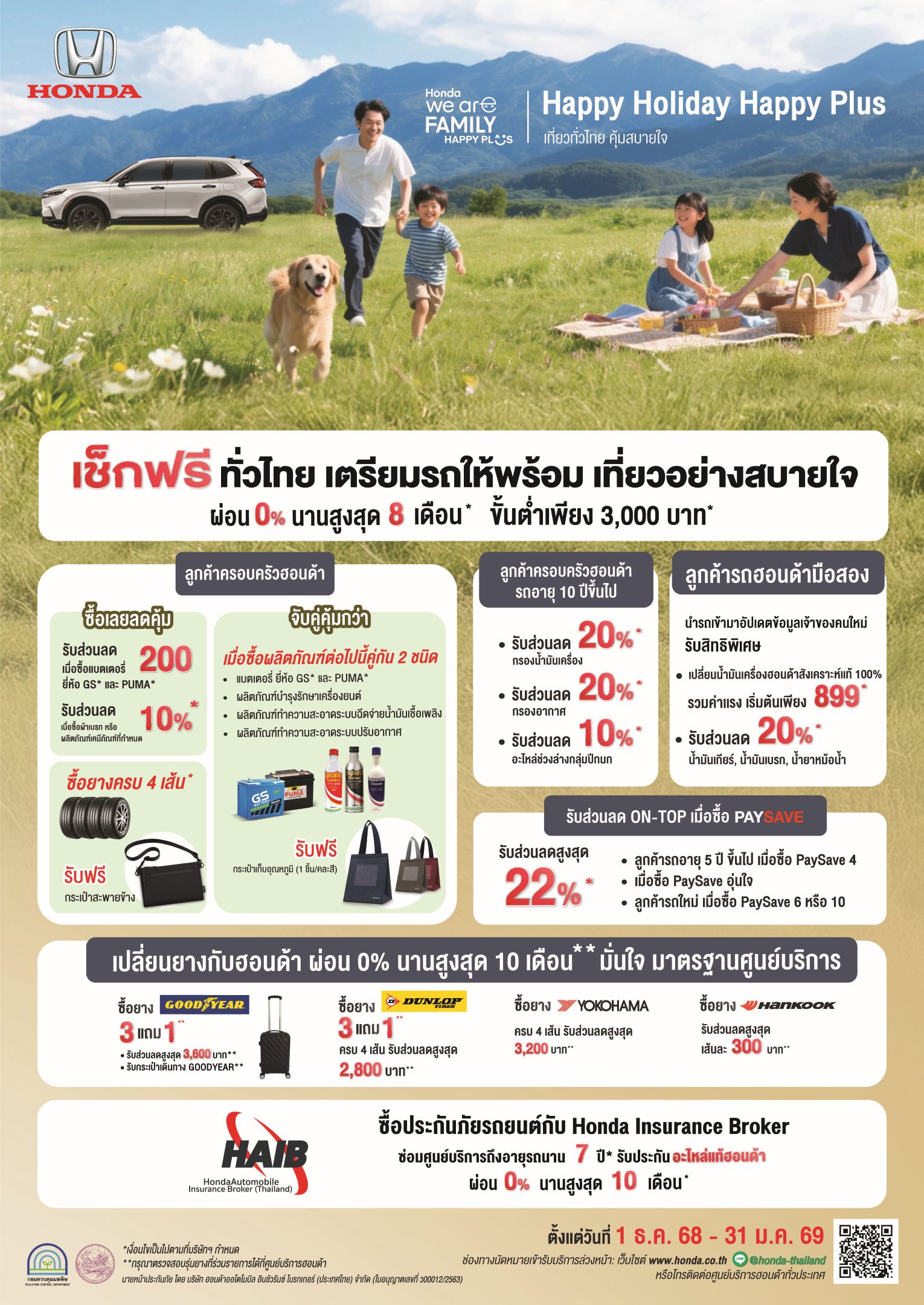 บริษัท ฮอนด้า ออโตโมบิล (ประเทศไทย) จำกัด เสิร์ฟความอุ่นใจส่งท้ายปีกับแคมเปญสุดพิเศษ “Happy Holiday Happy Plus! เที่ยวทั่วไทย คุ้มสบายใจ” พร้อมดูแลรถยนต์คู่ใจแบบครบวงจร สำหรับครอบครัวฮอนด้าบริการตรวจสภาพรถยนต์ฟรี* พร้อมผ่อนสบายไร้กังวล! สำหรับงานบริการทุกประเภท ผ่อนชำระ 0% นานสูงสุด 8 เดือน* อัปเกรดความคุ้มค่า รับส่วนลดผลิตภัณฑ์ที่กำหนดมูลค่าสูงสุด 20%* สำหรับครอบครัวฮอนด้าทั้งลูกค้ารถใหม่ รถเก่า และรถมือสอง พร้อมโปรแกรมผ่อนชำระยางรถยนต์ 0% นานสูงสุด 10 เดือน* สิทธิพิเศษสุดคุ้มที่ครบ จบ ทุกความต้องการ ! เพียงนัดหมายและนำรถยนต์เข้ารับบริการที่ศูนย์บริการรถยนต์ฮอนด้าทั่วประเทศ ตั้งแต่วันที่ 1 ธันวาคม 2568 ถึง 31 มกราคม 2569