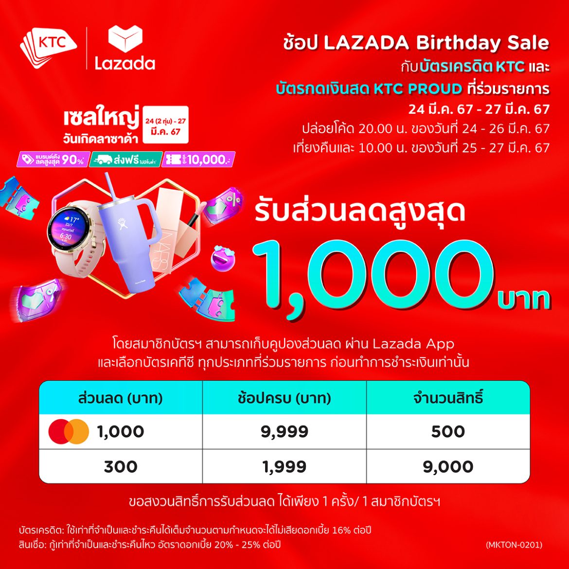 เคทีซีจัดแคมเปญร่วมฉลองครบรอบ 12 ปี ลาซาด้า ในประเทศไทย มอบความคุ้มค่าให้สมาชิกบัตรเครดิตเคทีซี-มาสเตอร์การ์ด และบัตรกดเงินสด “เคทีซี พราว มาสเตอร์การ์ด” รับส่วนลด 1,000 บาท เมื่อใช้จ่าย 9,999 บาทขึ้นไป ระหว่างวันที่ 24-27 มีนาคม 2567 โดยไม่ต้องใช้คะแนนและไม่ต้องลงทะเบียน