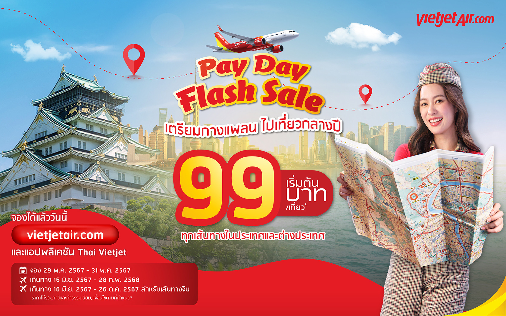 สายการบินไทยเวียตเจ็ทลดกระหน่ำ ออกโปรโมชั่น “เตรียมกลางแพลน ไปเที่ยวกลางปี (Pay Day Flash Sale)” เสนอบัตรโดยสารราคาพิเศษ เริ่มต้นเพียง 99 บาท (ราคาไม่รวมภาษีและค่าธรรมเนียม)  สำหรับเดินทางบนเครือข่ายเส้นทางบินภายในประเทศและระหว่างประเทศของไทยเวียตเจ็ท สามารถสำรองบัตรโดยสารได้ระหว่างวันที่ 29 – 31 พฤษภาคม 2567 ใช้เดินทางได้ระหว่างวันที่ 16 มิถุนายน 2567 – 28 กุมภาพันธ์ 2568 (ยกเว้นวันหยุดนักขัตฤกษ์) ที่ www.vietjetair.com