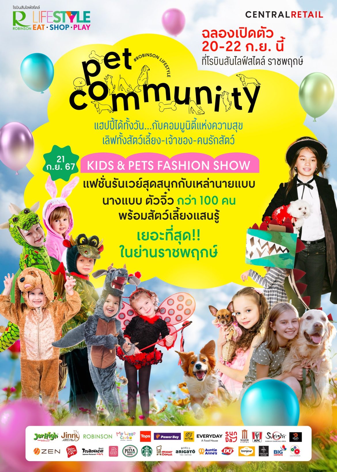 ศูนย์การค้าโรบินสันไลฟ์สไตล์ ในเครือเซ็นทรัล รีเทล ตอกย้ำความเป็นคอมมูนิตี้สำหรับคนรักสัตว์เลี้ยง ผนึกกำลัง 27 พาร์ทเนอร์ใหญ่ อาทิ JerHigh และ Jinny, PET ‘N ME, Major Cinema, ClickRobot, Power Buy, Tops, KFC, The Pizza Company, Sukishi, ZEN, Bonchon, Tsubohachi, ครัวเมืองเว้ ลาวญวน, พริกคั่วกะปิหอม, Mister Donut, Arigato, Auntie Anne’s, Starbucks, Dairy Queen, Bonjour, The Chocolate Factory และอื่น ๆ อีกมากมาย จัดบิ๊กอีเวนท์ “Pet Community” แฮ้ปปี้ได้ทั้งวัน กับคอมมูนิตี้แห่งความสุข เพื่อสัตว์เลี้ยง-เจ้าของ-คนรักสัตว์ วันที่ 20 ก.ย. 2567 – 22 ก.ย. 2567 ณ โรบินสันไลฟ์สไตล์ ราชพฤกษ์ ภายในงานพบกับกิจกรรมตลอด 3 วันเต็ม ไม่ว่าจะเป็นกิจกรรมพูดคุยเพื่อเจ้าของสัตว์เลี้ยงแสนรู้ทุกท่าน กับ สพ.ญ.อมรวรรณ บัววัฒน์ เจ้าของแบรนด์ Gentle Paws ในหัวข้อ ‘สุขอนามัยกับสุขภาพของสัตวเลี้ยง’, กิจกรรมร้องเพลงจากนักร้องรุ่นจิ๋ว, เนรมิตรจุดถ่ายภาพสุดน่ารัก พร้อมรับภาพ Polaroid เป็นของที่ระลึก และกิจกรรมอื่น ๆ อีกมากมาย เสริมทัพด้วยไอเท็มสุดคุ้มจากพาร์ทเนอร์ชั้นนำที่ขนทัพให้เหล่าเพ็ทเลิฟเวอร์เลือกสรรกันแบบจุใจจาก JerHigh และ Jinny, Gentle Paws และ CATE
