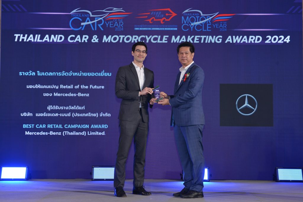 เมอร์เซเดส-เบนซ์ ประเทศไทย คว้า 2 รางวัล จากโครงการรางวัลรถยนต์ยอดเยี่ยมประจำปี (THAILAND CAR OF THE YEAR) ซึ่งจัดขึ้นโดยสมาคมผู้สื่อข่าวรถยนต์และรถจักรยานยนต์ไทย (สรยท.) นำโดยรถยนต์รุ่น “EQS 450 4MATIC SUV AMG Dynamic” ที่ได้รับรางวัล “รถยนต์ไฟฟ้ายอดเยี่ยมประจำปี 2567” (Thailand EV of the Year 2024) และรางวัล “โมเดลการจัดจำหน่ายยอดเยี่ยม” (Best Car Retail Campaign Award) จากการเปิดตัวโมเดลธุรกิจ “Retail of the Future” ที่เข้ามาพลิกโฉมธุรกิจค้าปลีกให้กับตลาดรถยนต์ระดับลักชัวรี่ในประเทศไทย