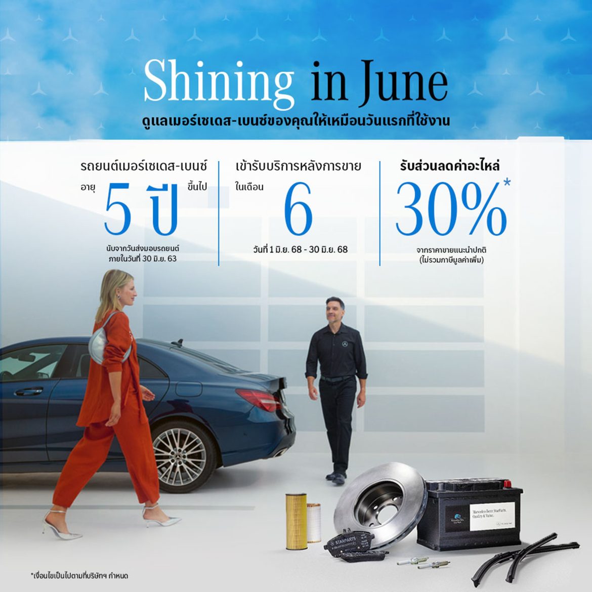 เมอร์เซเดส-เบนซ์ (ประเทศไทย) ให้ความสำคัญในการดูแลลูกค้าที่ใช้รถยนต์มากกว่า 5 ปี ให้คงสภาพการใช้งานให้เหมือนวันแรกที่ใช้งาน เพื่อตอบแทนความไว้วางใจของลูกค้าที่เข้ารับบริการอย่างต่อเนื่อง ด้วยแคมเปญ “Shining in June” มอบสิทธิพิเศษให้กับเจ้าของรถยนต์เมอร์เซเดส-เบนซ์ ทุกรุ่น (รวมถึงรถ Van) ที่มีอายุการใช้งานมากกว่า 5 ปี (นับจากวันส่งมอบรถยนต์ภายในวันที่ 30 มิถุนายน 2563) รับส่วนลดค่าอะไหล่ 30%* จากราคาขายแนะนำปกติ (ไม่รวมภาษีมูลค่าเพิ่ม) เมื่อนำรถเข้ารับบริการหลังการขาย ที่ศูนย์บริการเมอร์เซเดส-เบนซ์ อย่างเป็นทางการทั่วประเทศ ตั้งแต่วันที่ 1 มิถุนายน 2568 ถึง 30 มิถุนายน 2568 เพื่อมอบความมั่นใจให้กับลูกค้าคนสำคัญของเมอร์เซเดส-เบนซ์ ในทุกการเดินทาง