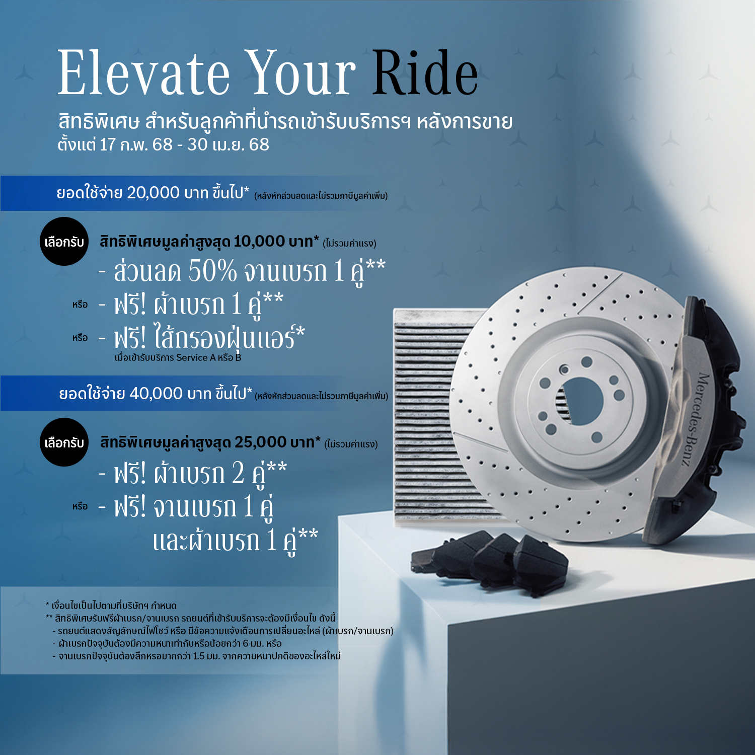 เมอร์เซเดส-เบนซ์ ประเทศไทย เดินหน้ายกระดับบริการหลังการขาย เพื่อตอบแทนลูกค้าคนสำคัญให้ทุกการเดินทางราบรื่นและมั่นใจยิ่งขึ้น ผ่านแคมเปญ “Elevate Your Ride” เมื่อนำรถยนต์เมอร์เซเดส-เบนซ์ ทุกรุ่น ทุกช่วงอายุของรถยนต์ (รวมรถ Van) มาเข้ารับบริการ ณ ศูนย์บริการเมอร์เซเดส-เบนซ์ อย่างเป็นทางการ และมียอดค่าใช้จ่ายผ่านศูนย์บริการฯ ตามที่กำหนด* ในช่วงระยะเวลาของแคมเปญ ระหว่างวันที่ 17 กุมภาพันธ์ 2568 – 30 เมษายน 2568 โดยลูกค้าจะได้รับสิทธิพิเศษ ดังนี้