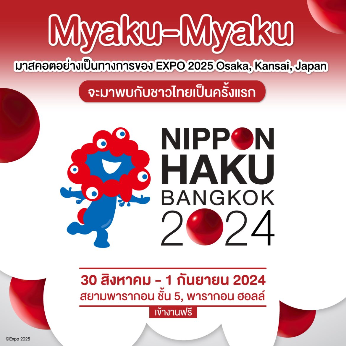 เตรียมมาร่วมเป็นส่วนหนึ่ง ในงาน NIPPON HAKU BANGKOK 2024 พร้อมร่วมสัมผัสและเรียนรู้เกี่ยวกับงานมหกรรมโลก EXPO 2025 Osaka, Kansai, Japan ที่กำลังเกิดขึ้นในปี 2025 และร่วมกิจกรรมสุดพิเศษแบบใกล้ชิดกับ เมียะคุ เมียะคุ (Myaku-Myaku) อีกด้วย