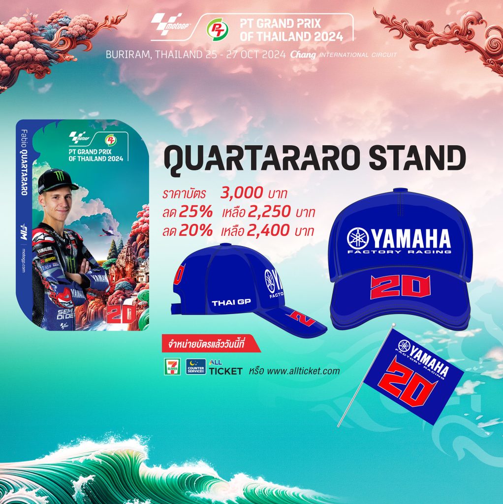 กวาร์ตาราโร สแตนด์ สำหรับแฟนฟาบิโอ กวาร์ตาราโร จะเป็นหมวกและธง สีน้ำเงิน ด้วยหมายเลข 20 และข้อความเป็นสีขาว Yamaha Factory team สัญลักษณ์ของทีมยามาฮ่าทีมโรงงาน