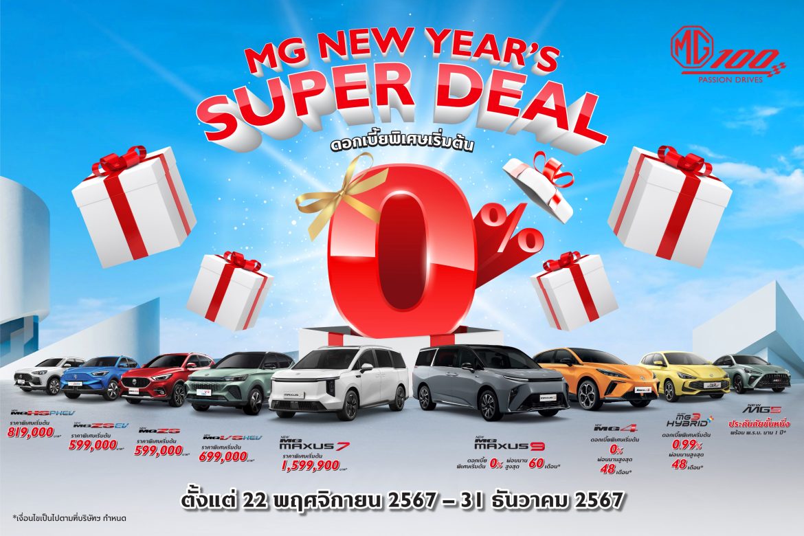 บริษัท เอสเอไอซี มอเตอร์ – ซีพี จำกัด และ บริษัท เอ็มจี เซลส์ (ประเทศไทย) จำกัด ผู้ผลิตและผู้จำหน่ายรถยนต์เอ็มจีในประเทศไทย มอบความคุ้มค่าผ่านแคมเปญ MG NEW YEAR’s SUPERDEAL ด้วยดอกเบี้ยต่ำสุด 0% นานสูงสุดถึง 5 ปี ฟรี ประกันภัยชั้น 1 พร้อม พ.ร.บ. นานสูงสุด 3 ปี และมั่นใจกับการใช้รถระยะยาวด้วยการรับประกันแบตเตอรี่ และระบบขับเคลื่อนตลอดอายุการใช้งานไม่จำกัดผู้ขับขี่ ตั้งแต่วันนี้ ถึงวันที่ 31 ธันวาคม 2567 ที่โชว์รูมและศูนย์บริการ เอ็มจี 140 แห่ง ทั่วประเทศ หรือจองออนไลน์ผ่านทางเว็บไซต์ https://onlinebooking.mgcars.com/ อีกทั้งแคมเปญนี้ ยังเป็นข้อเสนอพิเศษเดียวกันกับงานมอเตอร์เอกซ์โป 2024 (MOTOR EXPO 2024) อีกด้วย