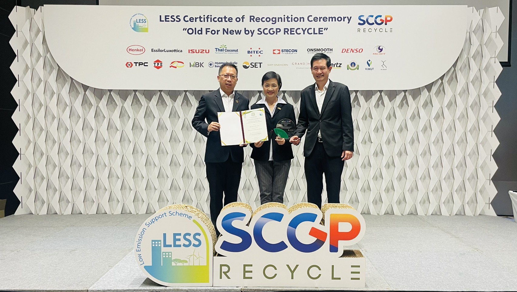 บริษัท เอ็ม บี เค จำกัด (มหาชน) นำโดย นางสาวศตกมล วรกุล ผู้อำนวยการอาวุโสฝ่ายสื่อสารองค์กร บริษัท อินเทลลิเจ้นท์ ครีเอทีฟ แอนด์ มาร์เก็ตติ้ง จำกัด (ที่ 2 จากซ้าย) เป็นผู้แทนบริษัท ฯ รับมอบโล่พร้อมใบประกาศเกียรติคุณ ที่ได้รับการประเมินว่าสามารถลดก๊าซเรือนกระจกได้ 63.322 ตันคาร์บอนไดออกไซด์เทียบเท่า ในโครงการสนับสนุนกิจกรรมลดก๊าซเรือนกระจก (Low Emission Support Scheme: LESS) ภายใต้โครงการ “Old For New โดย SCGP RECYCLE”   โดยมีนายณกรณ์ ตรรกวิรพัท​​ ผู้อำนวยการองค์การบริหารจัดการก๊าซเรือนกระจก (องค์การมหาชน) (ที่ 1 จากซ้าย) และนายดนัยเดช เกตุสุวรรณ ประธานเจ้าหน้าที่บริหารสายการเงิน บริษัท เอสซีจี แพคเกจจิ้ง จำกัด (มหาชน) (ที่ 3 จากซ้าย) เป็นผู้มอบ ณ อาคารอเนกประสงค์ สำนักงานใหญ่ SCG บางซื่อ กรุงเทพฯ  เมื่อเร็ว ๆ นี้