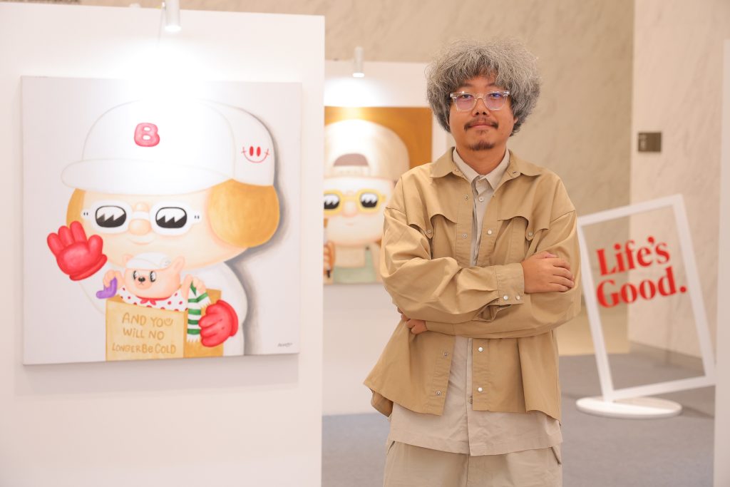 “ที่เลือกตัว BABYBOY HOME มาตั้งแสดงในงานนี้ เพราะคาแรกเตอร์นี้สื่อถึงการเป็นคนรักครอบครัวและความอบอุ่น เราตั้งชื่อคาแรกเตอร์นี้ว่า BABYBOY HOME เพราะอยากให้มันเป็นจุดเริ่มต้นของ BABYBOY ที่จะเปิดรับทุกคนให้มาอยู่ใน ‘บ้าน’ หลังนี้ได้อย่างมีความสุข เราอยากให้นิทรรศการนี้เต็มไปด้วยความอบอุ่นในการส่งต่อสิ่งดีๆ ให้กันและกัน โดยเฉพาะภาพวาด เราออกแบบจากโจทย์ของแคมเปญ “And You Will No Longer Be Cold #แล้วคุณจะไม่หนาวอีกต่อไป” ของทางแอลจี เพื่อเชิญชวนให้ผู้คนมาบริจาคเสื้อกันหนาว เราจึงอยากสร้างให้คาแรกเตอร์แต่ละตัวมีมูฟเมนต์ที่ดึงดูดและเข้าถึงความรู้สึกของผู้รับและผู้ให้ โดยดึงสีแดง เทา ขาว ดำ ซึ่งเป็นสีของแอลจีมาใช้เป็นหลัก ผสมด้วยสีอื่นๆ เข้าไปอีกนิดหน่อยเพื่อเพิ่มความสนุกและสดใส โดยชิ้นงานไฮไลต์ของนิทรรศการนี้คือรูป BABYBOY กำลังถือกล่องพัสดุ And You Will No Longer Be Cold ที่ภายในมีตุ๊กตาหมีกำลังถือผ้าพันคอกับถุงเท้า ทำท่าดีใจที่จะได้นำเสื้อผ้าเหล่านี้ไปส่งมอบให้กับคนที่กำลังรอรับอยู่ เราใช้หมีสีชมพูที่ดูสดใสตัวนี้เป็นตัวแทนความสุขของการแบ่งปัน ก็หวังว่าคนที่มาดูจะได้รับความรู้สึกนี้ และชอบผลงานนี้นะครับ” แม็ก-อัศนัย กล่าวทิ้งท้าย
