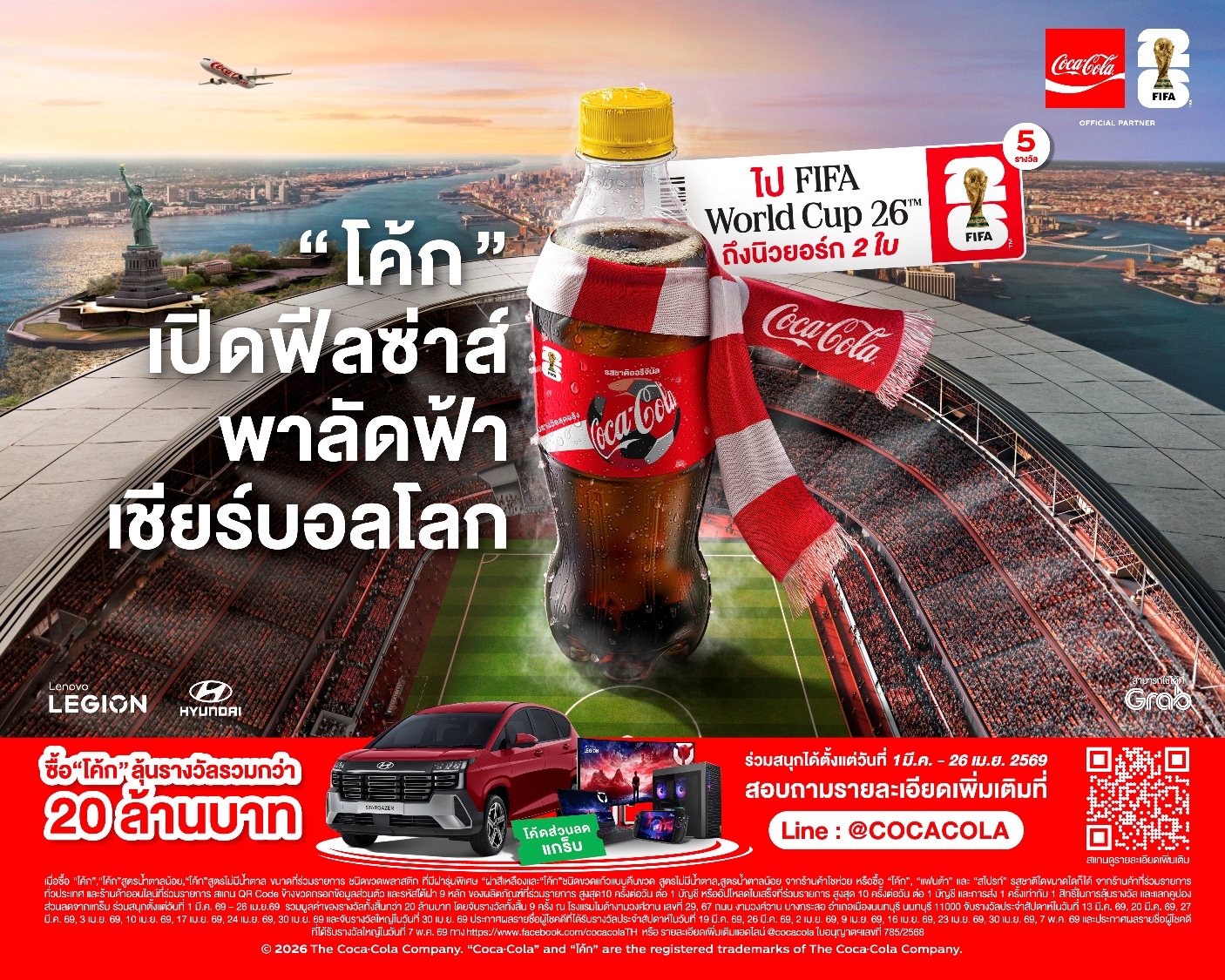 เพื่อเป็นการเฉลิมฉลองมหกรรมลูกหนังที่ยิ่งใหญ่ที่สุดในโลก โคคา-โคล่า ในฐานะพันธมิตรอย่างเป็นทางการของ FIFA ได้เตรียมรางวัลใหญ่สุดเอ็กซ์คลูซีฟที่จะทำให้ทุกคนต้องร้องว้าว กับ แพ็กเกจร่วมชมการแข่งขันฟุตบอลโลก FIFA World Cup 2026 จำนวน 5 รางวัล (รางวัลละ 2 ที่นั่ง) มูลค่ารางวัลละ 420,000 บาท รวมมูลค่า 2.1 ล้านบาท ที่จะพาผู้โชคดีบินลัดฟ้าสู่นิวยอร์ก พร้อมตั๋วเครื่องบินไป-กลับ ที่พัก อาหาร และการดูแลอย่างเหนือระดับตลอดทริป 4 วัน 3 คืน เพื่อให้แฟนบอลชาวไทยได้สัมผัสบรรยากาศความยิ่งใหญ่ของการแข่งขันฟุตบอลโลก FIFA World Cup 26™ ติดขอบสนามจริงครั้งหนึ่งในชีวิต