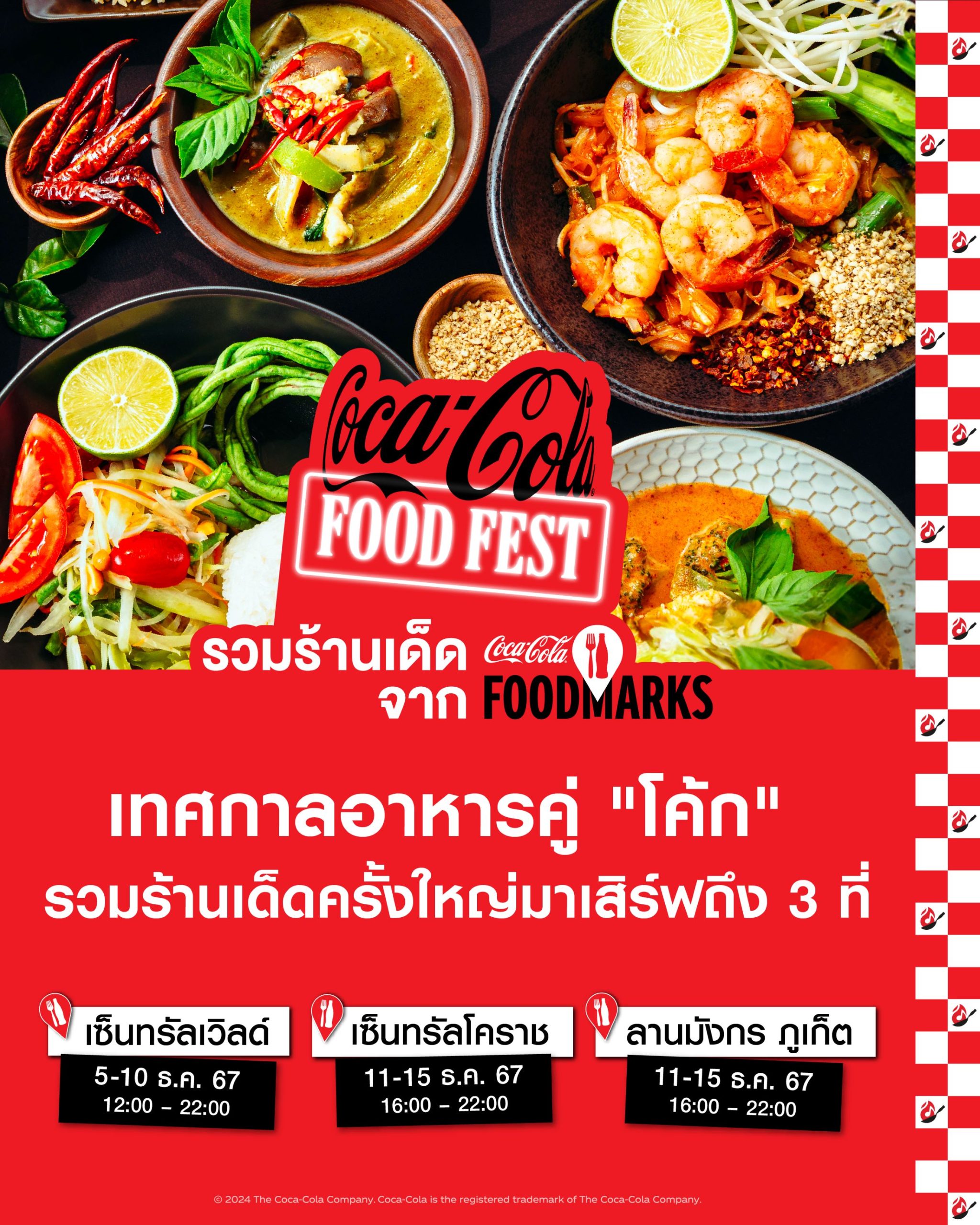กลุ่มธุรกิจโคคา-โคล่า ในประเทศไทย อันประกอบไปด้วยบริษัท โคคา-โคล่า (ประเทศไทย) จำกัด บริษัท ไทยน้ำทิพย์ คอร์ปอเรชั่น จำกัด และ บริษัท หาดทิพย์ จำกัด (มหาชน) จำกัด เตรียมเปิดมหกรรมความอร่อยส่งท้ายปีกับ ‘Coca-Cola’ Food Fest รวมร้านเด็ดสุดปังกว่า 138 ร้านจากแคมเปญ Foodmarks มาไว้ในงาน พร้อมกิจกรรมความสนุกแบบจัดเต็ม ให้คุณฉลองเทศกาลแห่งความสุขได้พิเศษยิ่งขึ้นเมื่อมี “โค้ก” ตั้งแต่ 5 – 10 ธ.ค. นี้ที่เซ็นทรัลเวิลด์ และ 11 – 15 ธ.ค. ที่เซ็นทรัล โคราช และสวนเฉลิมพระเกียรติ 72 พรรษา มหาราชินี จังหวัดภูเก็ต