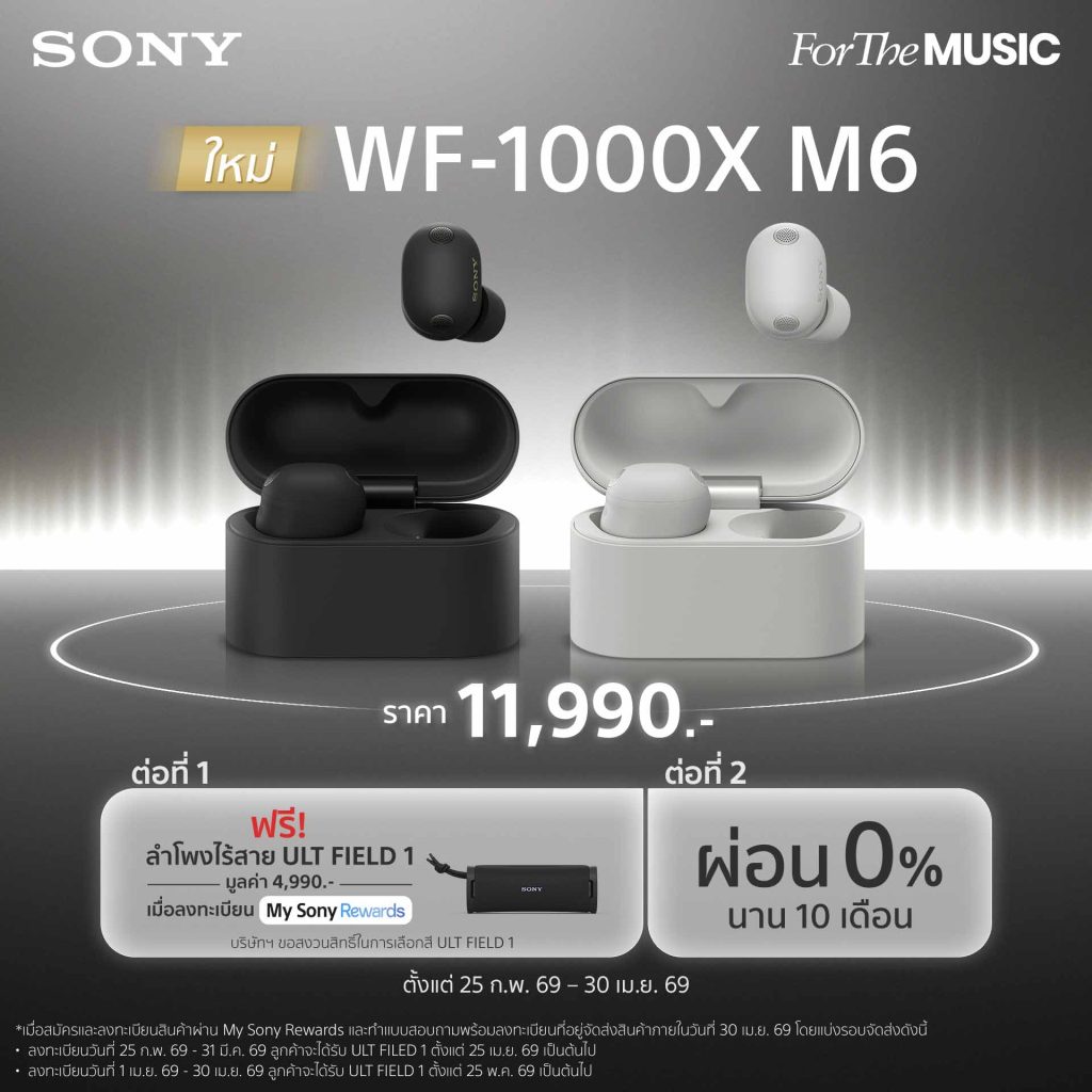 WF-1000XM6 พร้อมวางจำหน่ายอย่างเป็นทางการตั้งแต่วันที่ 25 กุมภาพันธ์ 2569 ในราคา 11,990 บาท โดยมีให้เลือกทั้งหมด 2 สี ได้แก่ สีดำ (Black) และสีแพลตตินัมซิลเวอร์ (Platinum Silver) พร้อมโปรโมชั่นพิเศษ รับฟรีลำโพงพกพาโซนี่ ULT FIELD 1 มูลค่า 4,990 บาท เมื่อซื้อหูฟัง WF-1000XM6 และลงทะเบียนรับประกันสินค้า My Sony ผ่านไลน์ @SonyThai พร้อมตอบแบบสอบถามที่จะได้รับทางอีเมลหลังการลงทะเบียนรับประกันสินค้าภายในวันเดียวกัน ตั้งแต่วันที่ 25 กุมภาพันธ์ 2569 – 30 เมษายน 2569