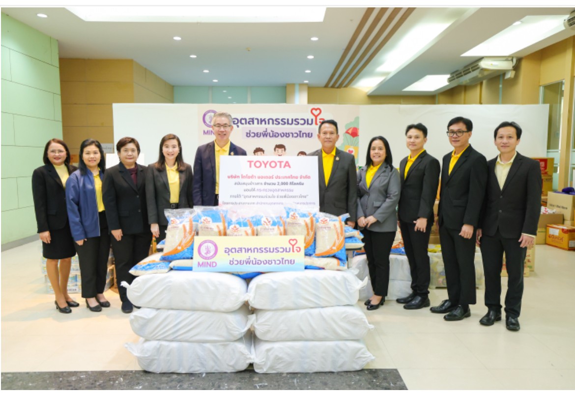 นายสุรภูมิอุดมวงศ์รองกรรมการผู้จัดการใหญ่บริษัทโตโยต้ามอเตอร์ประเทศไทยจำกัด มอบข้าวสารจากโรงสีข้าวรัชมงคล จำนวน 2,000 กิโลกรัม แก่กระทรวงอุตสาหกรรม  เพื่อร่วมช่วยเหลือผู้ประสบอุทกภัยทั่วประเทศ โดยมี นายณัฐพล รังสิตพล  ปลัดกระทรวงอุตสาหกรรม  เป็นตัวแทนรับมอบ ณ บริเวณห้องโถง ชั้น 1 สำนักงานปลัดกระทรวงอุตสาหกรรม เมื่อวันที่ 29 สิงหาคม 2567 ที่ผ่านมา