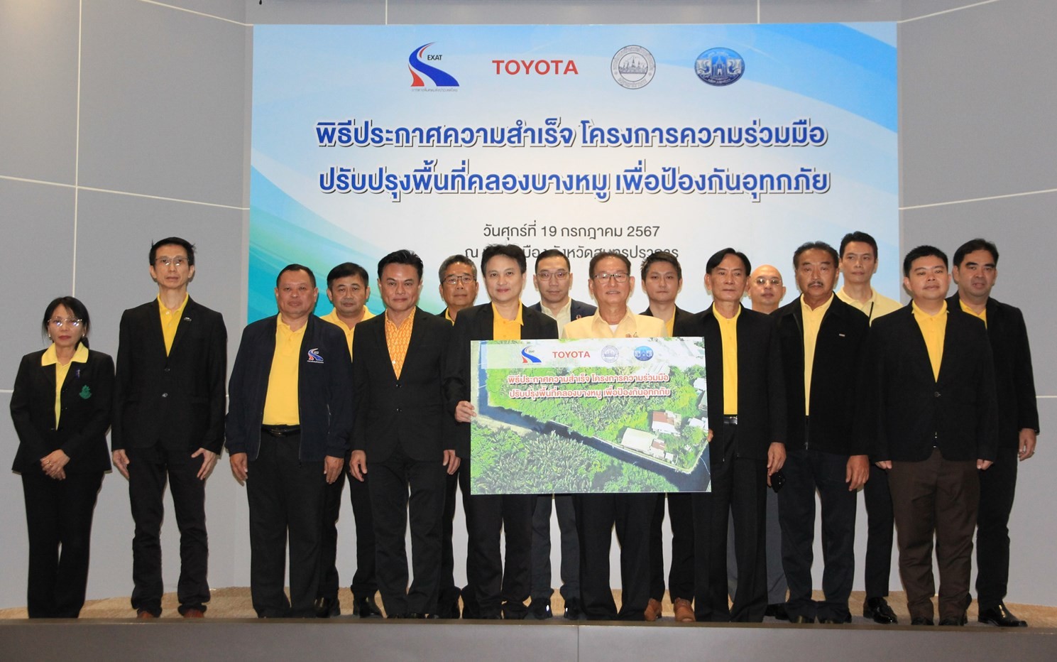นายนันทวัฒน์ ศรีวรัตน์อัชกุล ผู้ช่วยกรรมการผู้จัดการใหญ่ บริษัท โตโยต้า มอเตอร์ ประเทศไทย จำกัด ร่วมกับนายสมหวัง เกษมโกสินทร์ รองนายกองค์การบริหารส่วนจังหวัดสมุทรปราการ พร้อมด้วย นายวิทม สมใจ นายกองค์การบริหารส่วนตำบลบางด้วน และนายพิชัยยุทธ แป้นทอง ผู้อำนวยการกองพัฒนาและรักษาเขตทาง 2 การทางพิเศษแห่งประเทศไทย ร่วมเป็นสักขีพยานในพิธีประกาศความสำเร็จ จากความร่วมมือภายใต้โครงการ “ปรับปรุงพื้นที่คลองบางหมู เพื่อป้องกันอุทกภัย” ณ หอชมเมืองจังหวัดสมุทรปราการ เมื่อวันที่ 19 กรกฎาคม 2567 ที่ผ่านมา