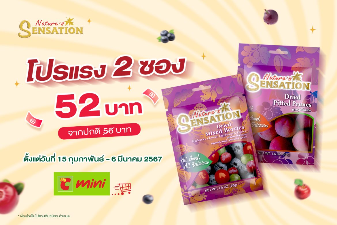 เนเจอร์ เซ็นเซชั่น แบรนด์ผลิตภัณฑ์ธัญพืช ผลไม้อบแห้ง และน้ำผลไม้ออร์แกนิคโดยเครือเฮอริเทจ ลดราคา ซื้อ เนเจอร์ เซ็นเซชั่น ผลไม้เบอร์รี่แห้งรวม (30 กรัม) และ เนเจอร์ เซ็นเซชั่น ลูกพรุนไม่มีเมล็ด (48 กรัม) 2 ซอง เหลือเพียง 52 บาท (จากปกติซองละ 28 บาท) ผลไม้อบแห้งแสนอร่อย เคี้ยวเพลินได้ทุกที่ทุกเวลา คุณภาพดีตามสไตล์ เนเจอร์ เซ็นเซชั่น หาซื้อได้แล้วที่บิ๊กซีมินิ ทุกสาขา ตั้งแต่วันที่ 15 กุมภาพันธ์ – 6 มีนาคม 2567 เท่านั้น สามารถสอบถามข้อมูลเพิ่มเติมหรือติดตามข่าวสารและกิจกรรมต่างๆได้ที่ https://www.facebook.com/naturessensationth และ IG: naturessensation