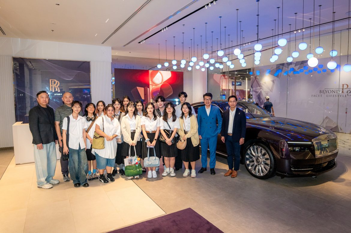 ภายในงานได้รับเกียรติจาก วิสูตร สุขพงษ์ กรรมการผู้จัดการ บริษัท วีทู ดีไซน์ สตูดิโอ จำกัด ในฐานะผู้ออกแบบงานการตกแต่งภายในโชว์รูม ตามแนวทาง New Visual Identity พาน้องๆ เยี่ยมชมพร้อมถ่ายทอดแนวคิดเบื้องหลังการออกแบบในส่วนต่างๆ ภายในบูทีคโชว์รูม ซึ่งมีรายละเอียดระดับเดียวกับโชว์รูมของ โรลส์-รอยซ์ ทั่วโลก โดยประสบการณ์การเข้ามาถึงโชว์รูม เริ่มต้นที่ประตูทางเข้าอันมีเอกลักษณ์ ลักษณะคล้ายกระจังหน้าของ โรลส์-รอยซ์ ที่ได้แรงบันดาลใจจากเสาของวิหารแพนทิออน พร้อมกับสัญลักษณ์นางฟ้า (Spirit of Ecstasy) ที่อยู่ด้านบน เมื่อก้าวสู่ด้านใน จะสัมผัสกับอัครยนตรกรรม โรลส์-รอยซ์ ดุจงานศิลป์ชิ้นเดียวในโลก ที่สอดผสานระหว่างวิศวกรรมยานยนต์กับงานหัตถกรรมที่ลงตัว จัดแสดงภายใต้ชุดไฟ kinetic lightning ที่สามารถปรับระดับให้ไล่ไปตามแนวหลังคาของรถแต่ละรุ่น มีพื้นที่จัดแสดงงานศิลป์สุดหรูหลากแบรนด์ เรียกว่า ‘Cabinet of Curiosities’ ช่วยขับกล่อมความสุนทรีย์ ขณะที่ไฮไลท์สำคัญอยู่ที่ ‘Atelier’ (อาทิลิเญ่) ห้องพิเศษส่วนตัว ให้ลูกค้าสามารถรังสรรค์ยนตรกรรมระดับมาสเตอร์พีช ประหนึ่งศิลปะชั้นสูงแบบ Bespoke โดดเด่นด้วยโต๊ะไม้ขนาดใหญ่ ไล่ระดับความลาดเอียง เปรียบเสมือนโต๊ะทำงานของศิลปินผู้เชี่ยวชาญ แอลอีดีทรงกลมที่แขวนจากเพดาน สามารถปรับระดับเพื่อตรวจสอบรายละเอียดของเนื้อสีหรือวัสดุต่างๆ รวมถึงตัวอย่างหลังคาดาวตก ‘Starlight Headliner’ ที่สามารถสัมผัสถึงความประณีตและพิถีพิถัน บรรจงเลือกสรรอย่างสอดคล้องกับบุคลิกของผู้ครอบครอง ได้อย่างลงตัว