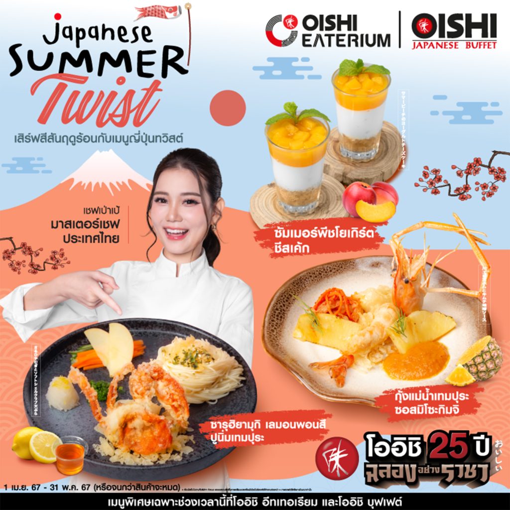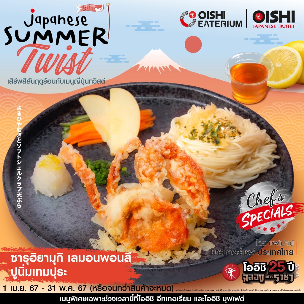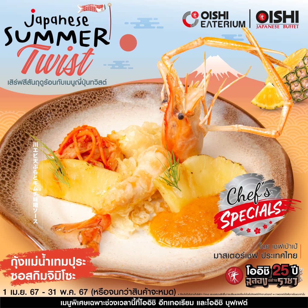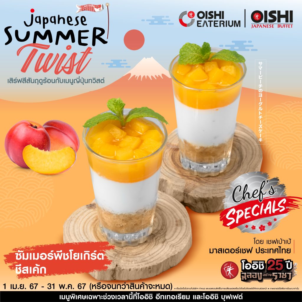 อิ่ม โอ-ร่อย เทศกาล “Japanese Summer Twist” พร้อมเมนูใหม่ในธีม “Japanese Sense & Inspiration” ขอแนะนำอาหารจานพิเศษ…รสชาติที่มีชีวิตชีวา แบบฉบับ เชฟเป่าเป้ มาสเตอร์เชฟ ประเทศไทย พลาดไม่ได้ ทั้ง เมนู “กุ้งแม่น้ำเทมปุระ ซอสมิโซะกิมจิ” เมนูที่คัดสรรกุ้งแม่น้ำตัวโต ๆ มาทอดในสไตล์เทมปุระ เสิร์ฟมากับน้ำซอสสูตรพิเศษ ที่ผสานรสชาติความเข้มข้นของกิมจิและความกลมกล่อมของมิโซะ…สุดลงตัว รับประทานพร้อมสับปะรดคาราเมลไลซ์ ให้รสชาติที่อร่อยและสดชื่นไม่เบา เมนู “ซารุฮิยามุกิ ปูนิ่มเทมปุระ” เสิร์ฟฮิยามุกิ (หรืออุด้งเส้นเล็ก) แบบเย็น ๆ เส้นเหนียวนุ่ม คู่ซอสพอนสึเลมอน เปรี้ยวกลมกล่อม รับประทานพร้อมปูนิ่มเทมปุระ ผัก และแอปเปิ้ลดอง หลากสีสัน เป็นเมนูที่ช่างสดชื่นและลงตัว และ เมนูขนมหวาน “ซัมเมอร์พีชโยเกิร์ตชีสเค้ก” ชีสเค้ก เนื้อสัมผัสเนียนนุ่ม เติมรสชาติเปรี้ยวอมหวาน…ลงตัว ด้วยโยเกิร์ต และซอสลูกพีชเข้มข้น รับประทานแบบเย็น ๆ ยิ่งอร่อยชื่นใจไปอีก