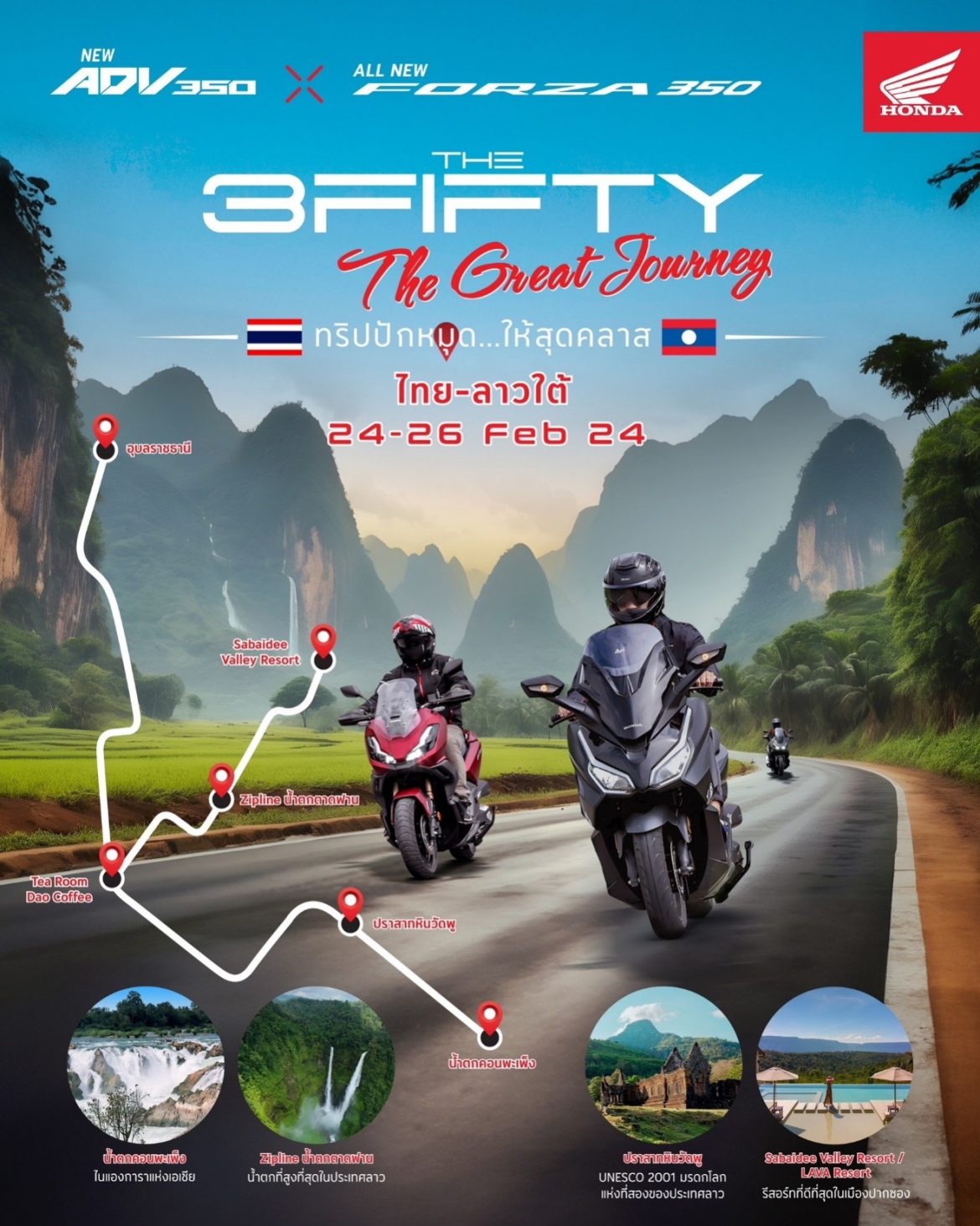 กิจกรรม ‘The 3Fifty Journey’ ประเทศลาวนี้ขับขี่ลุยเส้นทางธรรมชาติที่ท้าทาย พร้อมชวนเหล่าคอมมูนิตี้ในคลาส 350 อย่าง New Honda Forza350 และ ADV350 ออกไปสัมผัสอากาศบริสุทธิ์กับแหล่งท่องเที่ยวธรรมชาติ แวะเช็กอินกับสถานที่แลนด์มาร์กสำคัญของประเทศลาว ไม่ว่าจะเป็น น้ำตกคอนพะเพ็ง เกาะดอนเดด มรดกโลกแห่งที่สองของประเทศลาวอย่างปราสาทวัดพู และไฮไลต์ที่สำคัญเที่ยวชมน้ำตกตาดฟานพร้อมกิจกรรมซิปไลน์สุดตื่นเต้นที่สายลุยต้องได้ไปลอง พร้อมได้ไปเรียนรู้วัฒนธรรมของเพื่อนบ้านอย่างใกล้ชิด