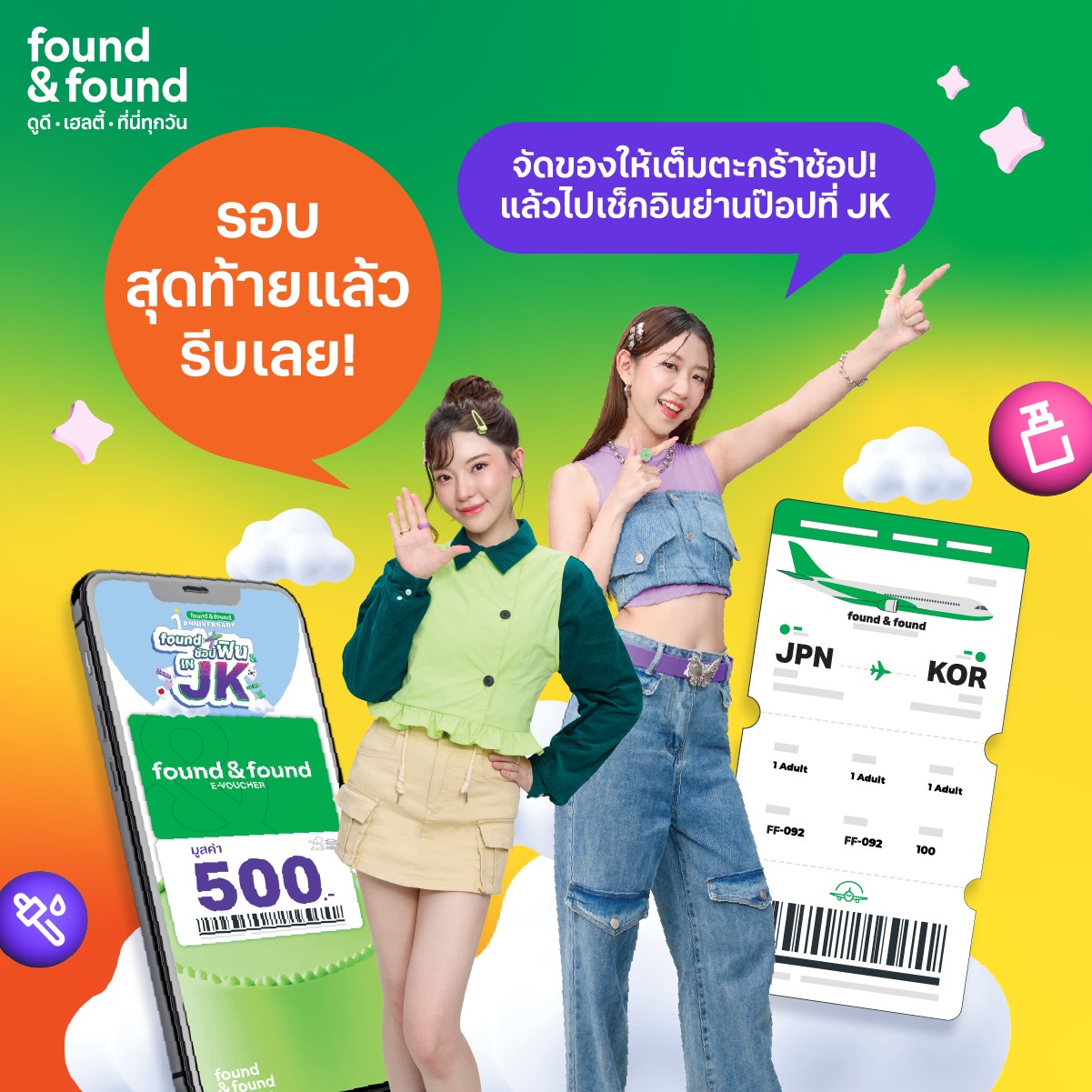 found & found เตรียมพาคุณไปสัมผัสทุกโมเมนต์ฟินที่ใครก็อยากมี กับแคมเปญ “found ช้อปฟิน IN JK” โอกาสสุดท้ายที่จะได้บินฟรีสู่ 2 บิวตี้เดสติเนชันแห่งเอเชีย ญี่ปุ่นและเกาหลี หลังจากประกาศผลรอบที่ 2 ได้ผู้โชคดีไปแล้ว 10 รางวัล รอบสุดท้ายนี้ แจกอีก 10 รางวัลใหญ่ให้คุณได้ร่วมลุ้น ทั้ง ทริปญี่ปุ่น 5 รางวัล และ ทริปเกาหลี 5 รางวัล รางวัลละ 2 ที่นั่ง รวม 20 ที่นั่ง ยังรอคุณคว้าอยู่ พร้อมรางวัล E-voucher มูลค่า 500 บาท อีก 91 รางวัล รวมของรางวัลตลอดแคมเปญทั้งหมด 111 รางวัล มูลค่ากว่า 2 ล้านบาท