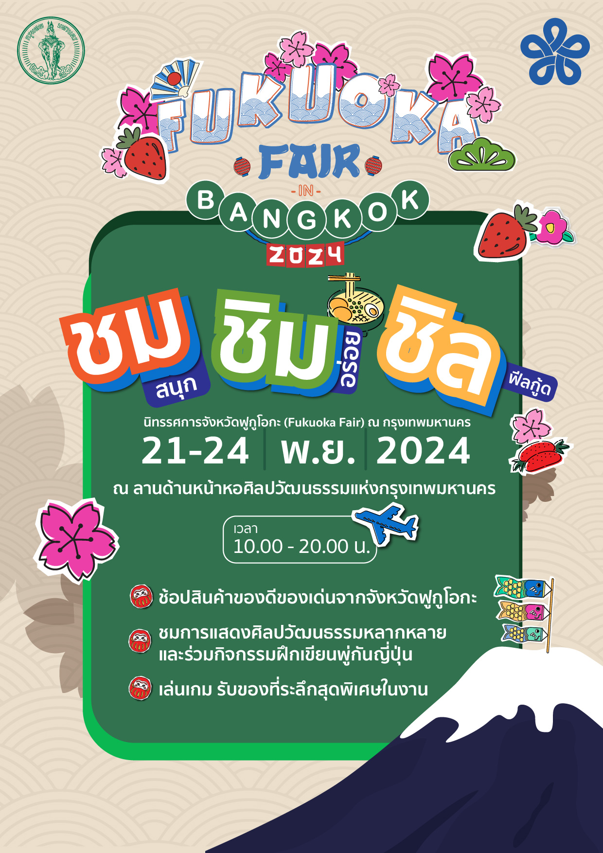 เตรียมปักหมุด พบกันที่งาน “Fukuoka Fair” in Bangkok ฟูกูโอกะมาเยือน สัมผัสบรรยากาศญี่ปุ่นขนานแท้ที่กรุงเทพฯ ชมสนุก ชิมอร่อย ชิลฟิลกู้ด พบกับการแลกเปลี่ยนวัฒนธรรมผ่านนิทรรศการและกิจกรรมต่างๆ ทั้งด้านอาหาร ดนตรี และความบันเทิงที่เป็นเอกลักษณ์ในแบบญี่ปุ่น ระหว่างวันที่ 21 – 24 พฤศจิกายน 2567 เวลา 10.00 – 20.00 น. ณ บริเวณหน้าหอศิลปวัฒนธรรมแห่งกรุงเทพมหานคร (BACC)