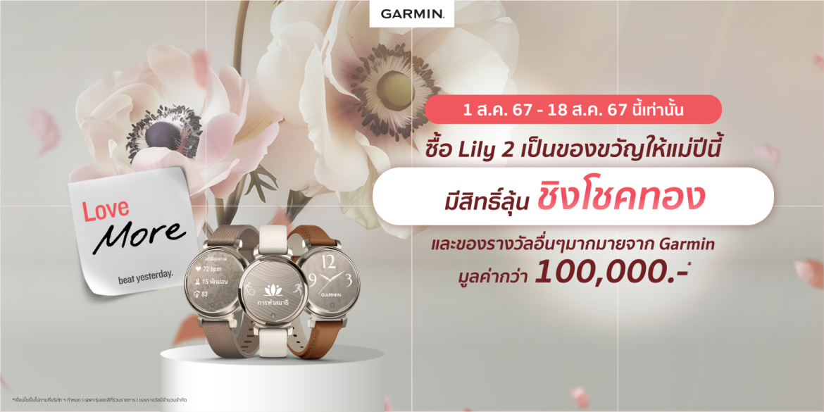 Garmin ต้อนรับเทศกาลวันแม่ผ่านแคมเปญ Love More with Garmin ชวนมอบสุขภาพดีเป็นของขวัญตอบแทนความรักอันยิ่งใหญ่ของคุณแม่ พร้อมเพิ่มความสุขให้มากกว่าเดิม เพียงซื้อ Garmin LILY 2 และ LILY 2 Classic สีใดก็ได้ จากร้านค้าและร้านออนไลน์ที่เป็นตัวแทนจำหน่ายอย่างเป็นทางการของการ์มิน ประเทศไทย ตั้งแต่วันที่ 1 – 18 สิงหาคม 2567 นำใบเสร็จลงทะเบียนผ่านลิงค์ https://www.garmin.com/th-TH/forms/2024-lucky-draw/ รับสิทธิ์ลุ้น รางวัลที่ 1 สร้อยคอทองคำหนัก 1 บาท จำนวน 1 รางวัล  รางวัลที่ 2 สร้อยข้อมือทองคำ 1 สลึงจำนวน 2 รางวัล  รางวัลที่ 3 ชุดของขวัญ กระบอกน้ำเก็บความเย็นและกระเป๋าผ้า Garmin จำนวน 15 รางวัล รางวัลที่ 4 ชุดของขวัญ ร่มกันฝนและกระเป๋าผ้า Garmin จำนวน 15 รางวัล และรางวัลที่ 5 คูปองส่วนลด 20% แลกซื้อนาฬิกา Garmin ณ ร้านค้าที่เข้าร่วมรายการ4 รวมมูลค่ากว่า 100,000 บาท ติดตามข้อมูลเพิ่มเติมได้ที่ เฟซบุ๊กแฟนเพจ Garmin Thailand อินสตาแกรม Garmin Thailand และตัวแทนจำหน่ายอย่างเป็นทางการของการ์มินทุกสาขา