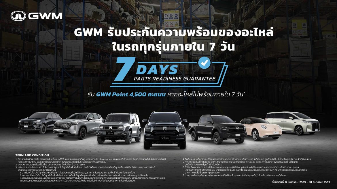 แม้รถยนต์จากประเทศจีนจะมีการเติบโตอย่างรวดเร็วในประเทศไทย แต่ผู้บริโภคจำนวนมากยังลังเลที่จะเป็นเจ้าของเพราะประสบการณ์ที่ได้ยิน ได้เห็นทั้งจากคนใกล้ตัวและเสียงจากชาวเน็ต หรือกระทั่งเคยพบเจอด้วยตนเองเกี่ยวกับการรออะไหล่นาน ระยะเวลาซ่อมที่ไม่แน่นอน และระบบการบริการหลังการขายที่ยังไม่น่าไว้วางใจ GWM จึงตอบโจทย์แบบ “จบให้ตรงจุด” ด้วยแคมเปญ GWM รับประกันความพร้อมของอะไหล่ภายใน 7 วัน” หลังการยืนยันคำสั่งซ่อมของลูกค้า* เพื่อเป็นการสร้างความมั่นใจด้านการบริหารจัดการอะไหล่ที่มีประสิทธิภาพของ GWM และการบริการที่ฉับไว หมดปัญหาและความกังวลใจในการรออะไหล่เป็นระยะเวลายาวนาน โดยหากลูกค้าได้รับอะไหล่ช้ากว่า 7 วันที่กำหนด ลูกค้าจะได้รับ GWM Points จำนวน 4,500 คะแนน เป็นการชดเชย โดยสามารถใช้แลกสินค้าและบริการผ่าน GWM Application แคมเปญนี้ครอบคลุมรถ GWM ทุกรุ่น และมีผลตั้งแต่วันที่ 12 มกราคม – 31 ธันวาคม 2569