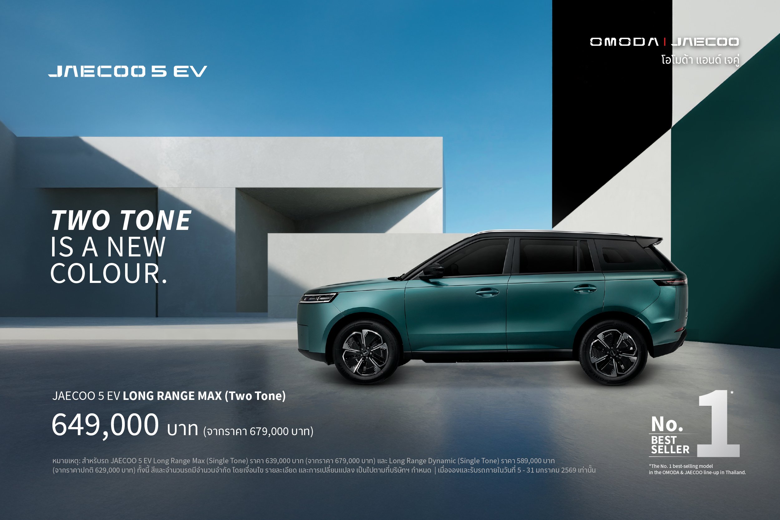 JAECOO 5 EV Long Range Max (Two Tone) เปิดตัวพร้อมราคาจำหน่ายที่สะท้อนความมุ่งมั่นของ OMODA & JAECOO ในการนำเสนอผลิตภัณฑ์ที่มีความคุ้มค่า เข้าถึงได้ และตอบโจทย์ความต้องการของผู้บริโภคในตลาดรถยนต์ไฟฟ้าที่เติบโตอย่างต่อเนื่อง โดยมาพร้อมราคาพิเศษ 649,000 บาท จากราคาปกติ 679,000 บาท สำหรับลูกค้าที่ทำการจองและรับรถภายในช่วงวันที่ 5–31 มกราคม 2569 ซึ่งนับเป็นอีกหนึ่งก้าวสำคัญในการขยายโอกาสให้ผู้บริโภคชาวไทยสามารถเข้าถึงยนตรกรรมไฟฟ้าที่ผสานดีไซน์ สมรรถนะ และนวัตกรรมได้อย่างสมดุล